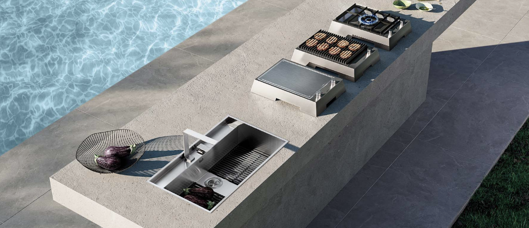 The Thalas telescopic tap takes the same approach. When not in use, it retracts and disappears beneath a flush cover; the sink reads as a clean surface rather than a plumbing fixture. It returns to full function with a remote control. These details are not features listed in a specification sheet. They are the expression of a design position: that an outdoor kitchen should